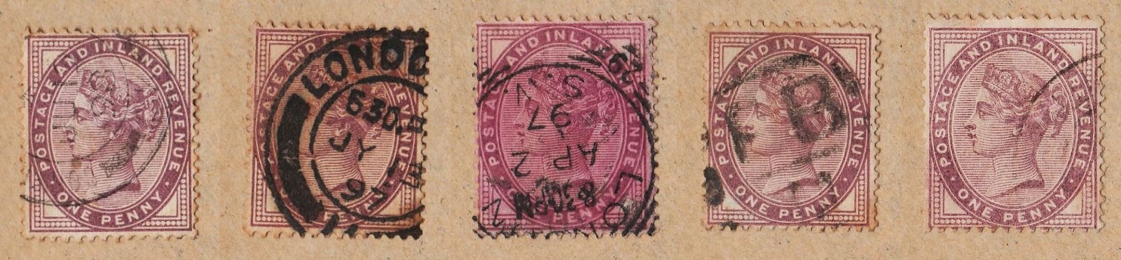 this stamp differs from the other famous Penny stamps (Black, Red and Venetian Red) not only on the form of the vignette's frame (squared frame in the previous..) but in the labels surrounding the portrait.. (instead of the 'Postage' and 'One Penny' labels , the Lilac Penny presents ' Postage and Inland Revenue' and 'One Penny')..It is known that the lilac ink used in these printings was very fugitive ,so it not strange to find all these different shades in used and washed stamps...in my opinion ,from this five stamps the one that is closer to the original,but yet very far is the first one...the color used was darker and brighter...