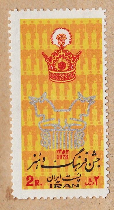 All the stamps from this period present large and complex wmks , and I cannot , even in my remote dreams ,know what they represent ...Talking now about these two stamps, I can say that they were issued to commemorate the same event in the consecutive years of 1972 and 1973...the 'stand out' picture represent the Power of the Shah's Monarchy over different backgrounds and colors..the blue background represent us several Industries and Social sectors ,repeated one or more times, but the Orange/Yellow background of 73 is for sure much more imaginative for the time frame We were living...it is one of those designs that appeal to our vision to see different images in orange or yellow...very nice (of course, in our days this is common , but in the 70's it was not...!)