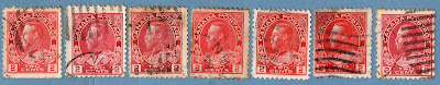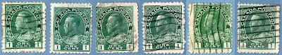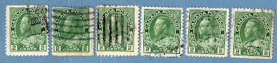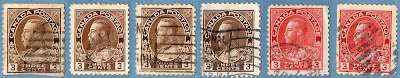 the following stamps came , as I said before, in a lot I bought recently... one thing that make me feel somehow perplexed , was the quantity of stamps from this next series, that in a first view and after looking through Scott World , seem to be a normal series without anything strange...this fact led me to buy a cheap and old specialized Canadian catalog...And there it was..! After all there was a small secret..! this catalog says that this variety only happens in the 3c stamp, but the lot I bought brought me along several stamps of the other values also, so I think the person who owned the lot knows about this small secret but though it could happen in any of the stamps