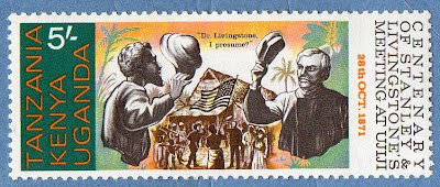 Here we have a stamp about an historic event.. the meeting in Ujiji between the Missionary David Livingstone and the American (??) journalist H.M. Stanley... this is one of those 'rich' stamps, full of history and new facts to know about...